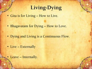 This document summarizes some key concepts from the Bhagavad Gita. It discusses how the Gita deals with living and dying, and how its principles are meant for living rather than poetic imaginations. It outlines 5 truths of life according to the Gita: 1) Ishvara (God), 2) Prakriti (nature), 3) Kala (time), 4) Jiva (the soul), and 5) Karma (action and reaction). It also lists and briefly describes 9 extended principles from the Gita: 1) Dvandva (duality), 2) Vividhatha (diversity), 3) Sva-dharma (duty), 4) Loka-sang