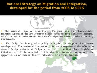 This document summarizes Bulgaria's National Strategy on Migration and Integration from 2008-2015. The strategy has two main goals: 1) attracting Bulgarian citizens living abroad and people of Bulgarian origin living in other countries to return and settle in Bulgaria, and 2) implementing an adequate policy for accepting foreigners and integrating them while controlling migration processes. It outlines priorities and measures to achieve these goals, including programs to return Bulgarian citizens and attract those of Bulgarian origin, reviewing and updating legislation, identifying labor market needs, and implementing consistent refugee and asylum policies.