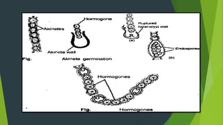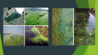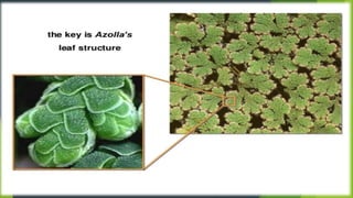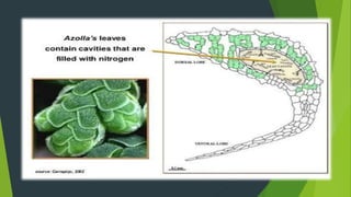 Blue-green algae, also known as cyanobacteria, are photosynthetic bacteria that produce oxygen. They possess chlorophyll and can fix nitrogen. Azolla is an aquatic fern that has a symbiotic relationship with nitrogen-fixing cyanobacteria. It grows easily and can be used as green manure to improve soil nutrition. Both blue-green algae and Azolla are important for agriculture - blue-green algae fix nitrogen while Azolla acts as a biofertilizer when used in rice fields and on other crops.