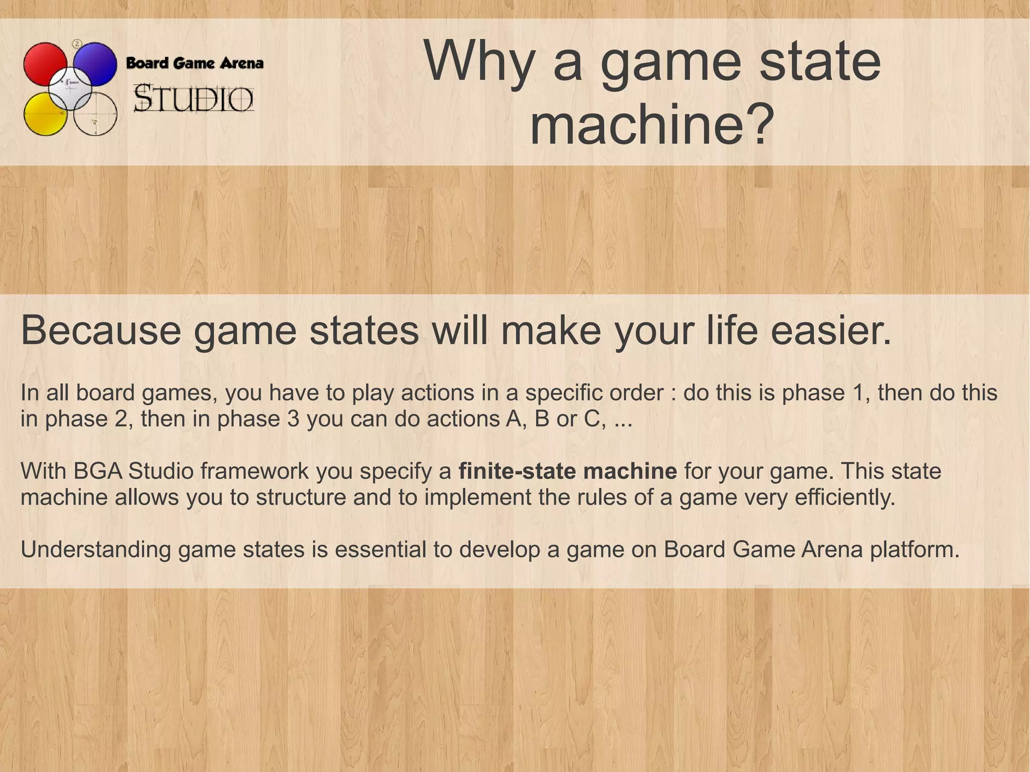 The document explains the importance of implementing a game state machine when developing board games using the BGA Studio framework. It details how game states dictate game actions, player turns, and transitions between different phases of the game, as well as providing insights on defining and managing these states through code. Additionally, it highlights the role of game states in facilitating automation and improving code organization, making the development process more efficient and reliable.