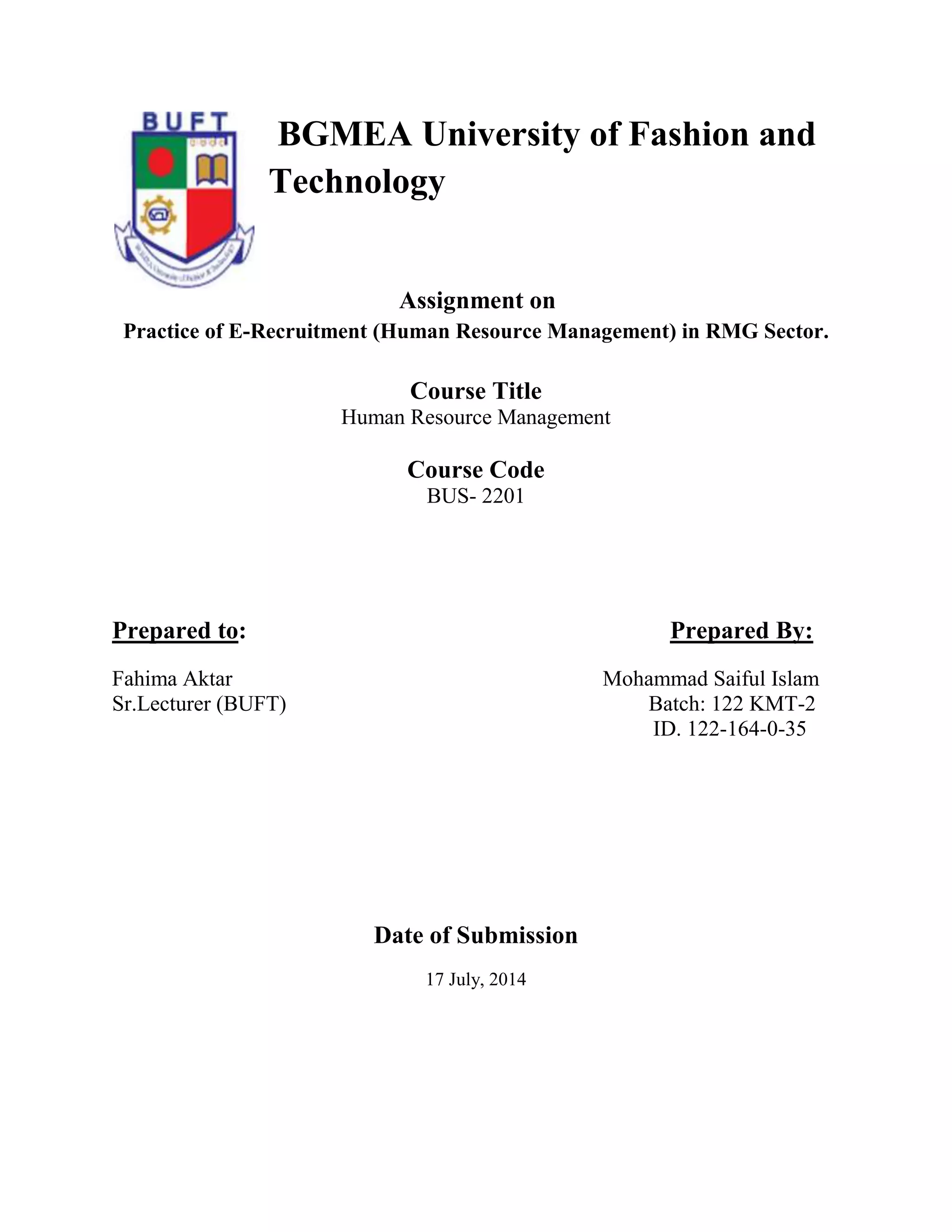 The document is an assignment on the practice of e-recruitment in Bangladesh's ready-made garment (RMG) sector, highlighting its significance in human resource management. It discusses the benefits of e-recruitment for organizations and candidates, as well as the challenges faced, such as the failure to fill specific job vacancies online. Recommendations include improving organizational policies and web presence to enhance candidate job satisfaction and security.
