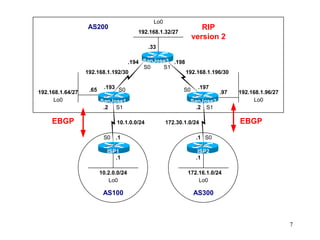 - The document describes a lab scenario demonstrating basic BGP configuration and operation between autonomous systems.