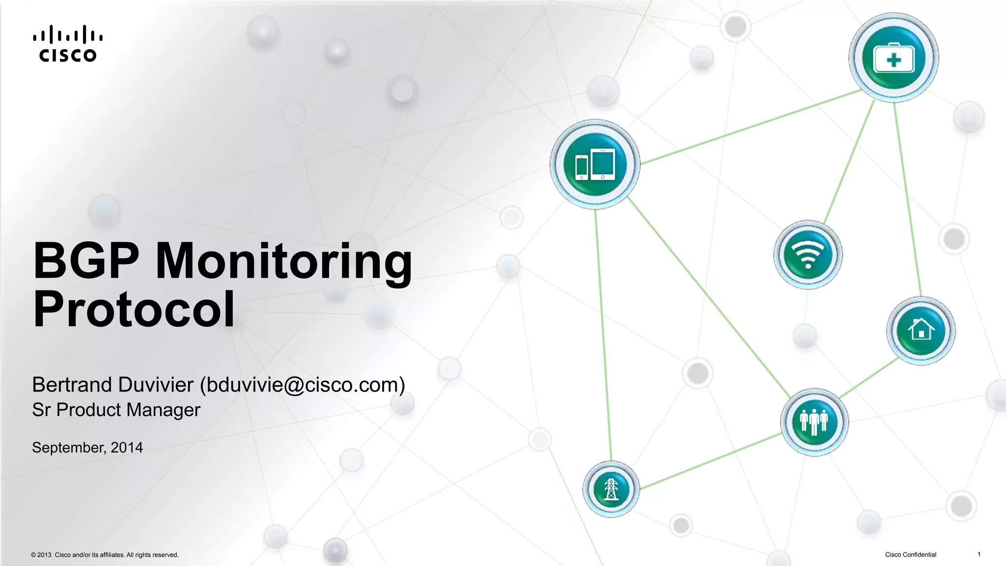 BMP (BGP Monitoring Protocol) allows routers to send BGP peer route updates and statistics to external monitoring stations. It provides access to the pre-policy routing table (Adj-RIB-In) of peers on an ongoing basis. Cisco supports BMP in IOS-XE and IOS-XR routers. OpenBMP is an open-source BMP collector that stores updates in a MySQL database for analysis.