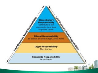 The document provides an outline for a lecture on corporate social responsibility (CSR). It discusses the types and nature of social responsibilities, CSR principles and strategies, models of CSR, best practices, the need for CSR, and arguments for and against CSR. Examples of CSR programs and initiatives from companies like Tesco, Vodafone, and HSBC are also summarized. The document aims to educate about the concept of CSR and how companies can integrate social and environmental concerns into their business operations and interactions with stakeholders.