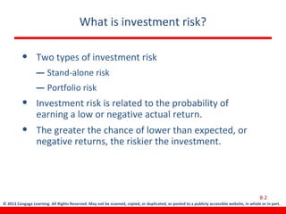 This document discusses various concepts related to investment risk and rates of return. It covers stand-alone risk, portfolio risk, standard deviation as a measure of risk, the benefits of diversification in reducing portfolio risk, and the capital asset pricing model. The key points are: 1) a portfolio's risk is generally lower than the average risk of its individual components due to diversification, especially if the components are not perfectly positively correlated; 2) standard deviation measures total risk while the coefficient of variation allows comparison of risk levels for investments with different returns; and 3) the capital asset pricing model suggests investors should only be compensated for non-diversifiable market risk, not company-specific risk.