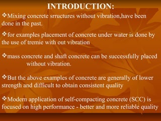 This document provides an overview of self-compacting concrete (SCC). It discusses how SCC was developed in the late 1980s in Japan to allow for concrete placement without vibration. SCC offers advantages like lower noise, easier placement, and improved quality. The document outlines common applications of SCC and test methods used to evaluate the flowability and segregation resistance of fresh SCC. It also summarizes research showing that hardened SCC has similar structural properties as high-performance vibrated concrete in terms of strength, modulus of elasticity, and bond strength.