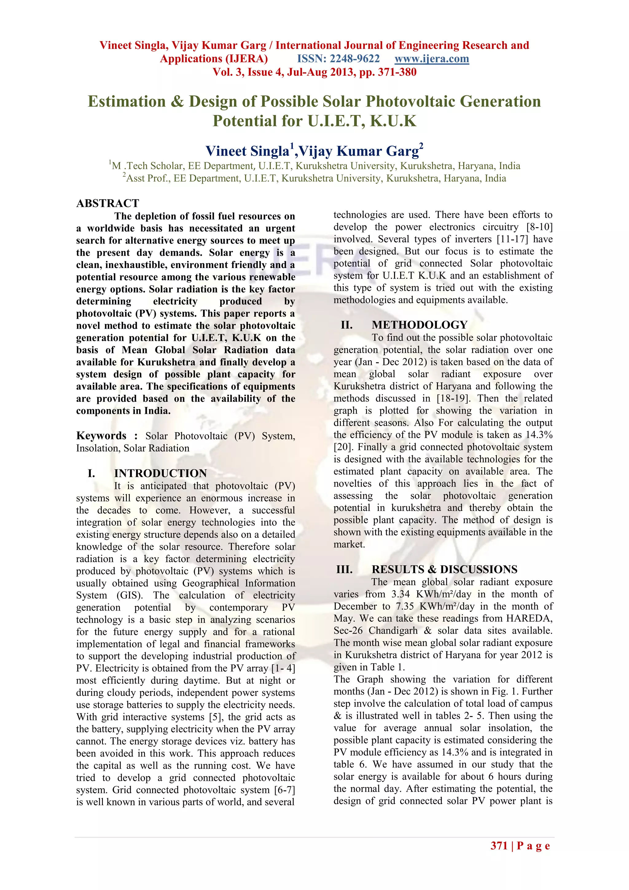 The document details a study on estimating the solar photovoltaic generation potential for the University Institute of Engineering and Technology (U.I.E.T), Kurukshetra, based on solar radiation data specific to the region. It presents a methodology for calculating the solar insolation, factors in the efficiency of photovoltaic systems, and discusses the design of a grid-connected solar PV system tailored to local conditions. Results indicate variations in solar radiation throughout the year, aiding the design and estimation of the potential plant capacity for renewable energy generation.