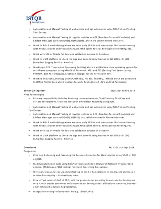 The document contains the resume of Bhabani Shankar Behera which outlines his contact information, 5 years of experience in automation and manual testing, current role as a Senior QA Engineer at Amadeus Labs, previous experience as a Senior QA Engineer at Ness Technologies and as a Consultant at Capgemini, education including a Bachelor's degree in Electronics and Telecommunication Engineering, and technical skills including tools like SOAP UI PRO, QTP, ALM, and languages like VB Scripting, Java and Python.