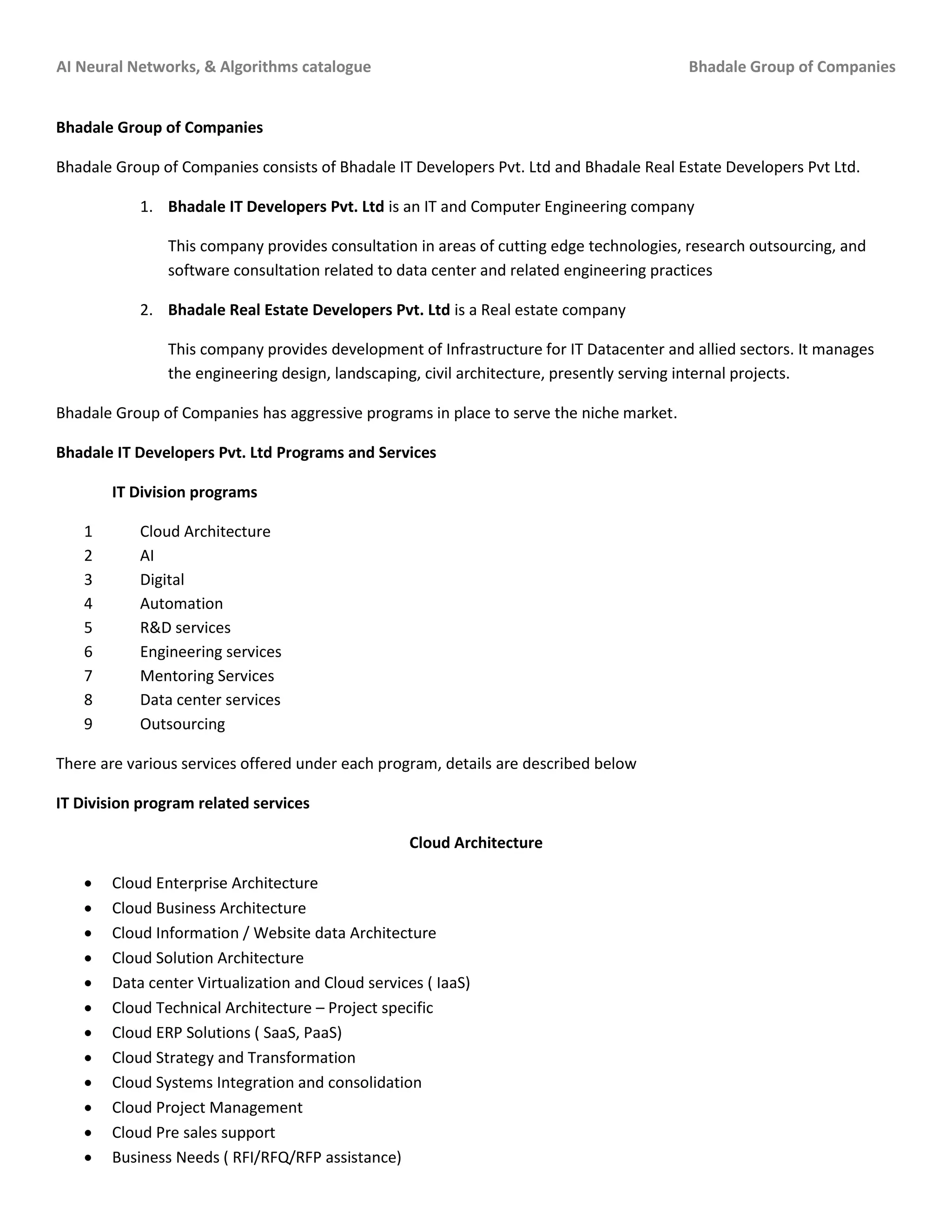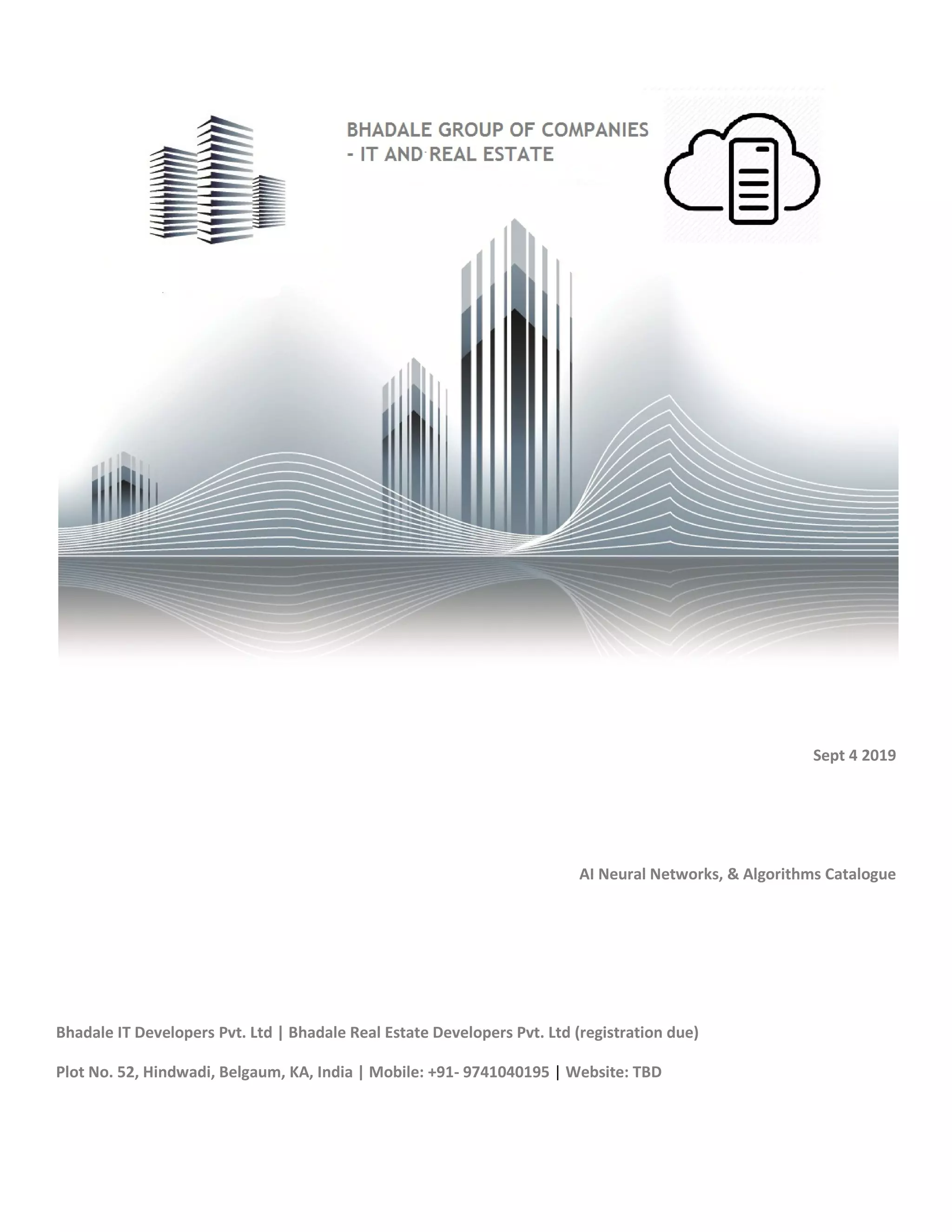 The document outlines the services offered by Bhadale Group of Companies, which includes Bhadale IT Developers Pvt. Ltd. and Bhadale Real Estate Developers Pvt. Ltd., detailing their expertise in AI, cloud architecture, automation, and engineering services tailored for IT and data centers. It provides an extensive catalogue of artificial neural network types and their use cases, such as feedforward networks, recurrent networks, and variational autoencoders, emphasizing their applications in areas like classification, regression, and natural language processing. Additionally, the document discusses consulting and outsourcing services aimed to enhance technological capabilities across various sectors.
