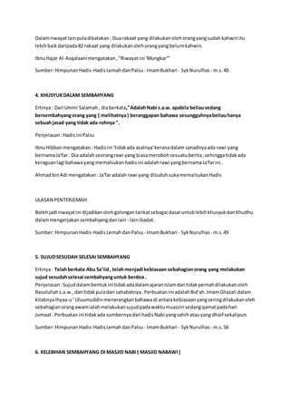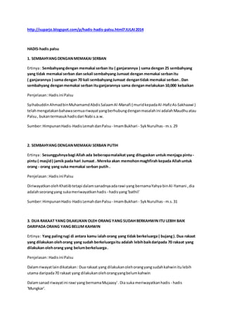 Dokumen ini menyoroti berbagai hadis palsu terkait amalan ibadah dalam Islam, seperti sembahyang dengan serban dan keutamaan dua rakaat bagi yang sudah berkahwin. Setiap hadis yang diuraikan disertai dengan penjelasan mengenai ketidakvalidannya dan alasan mengapa ia dianggap maudhu' atau lemah. Ulasan ini bertujuan untuk mengedukasi pembaca tentang pentingnya verifikasi sumber hadis dalam praktik ibadah.