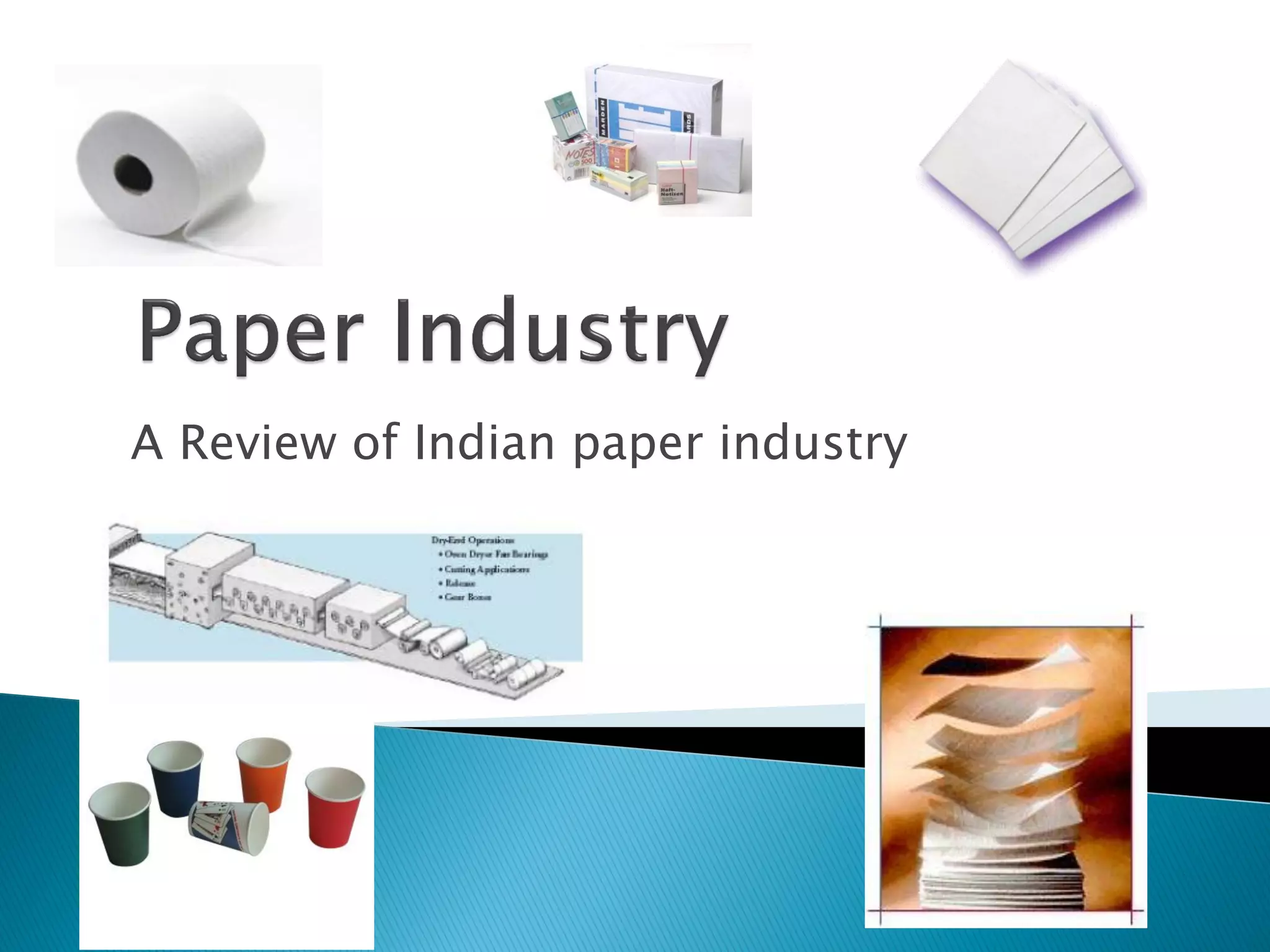 The document provides an overview of the Indian paper industry. It notes that India is the 15th largest paper producer in the world, with the industry employing nearly 1.5 million people. Per capita paper consumption in India is estimated to be 7 kg in 2006, much lower than global and Asian averages. The industry is expected to face challenges in meeting growing demand due to constraints on raw material availability. Projections estimate paper demand in India could double by 2015 and reach 21 million tonnes by 2020.