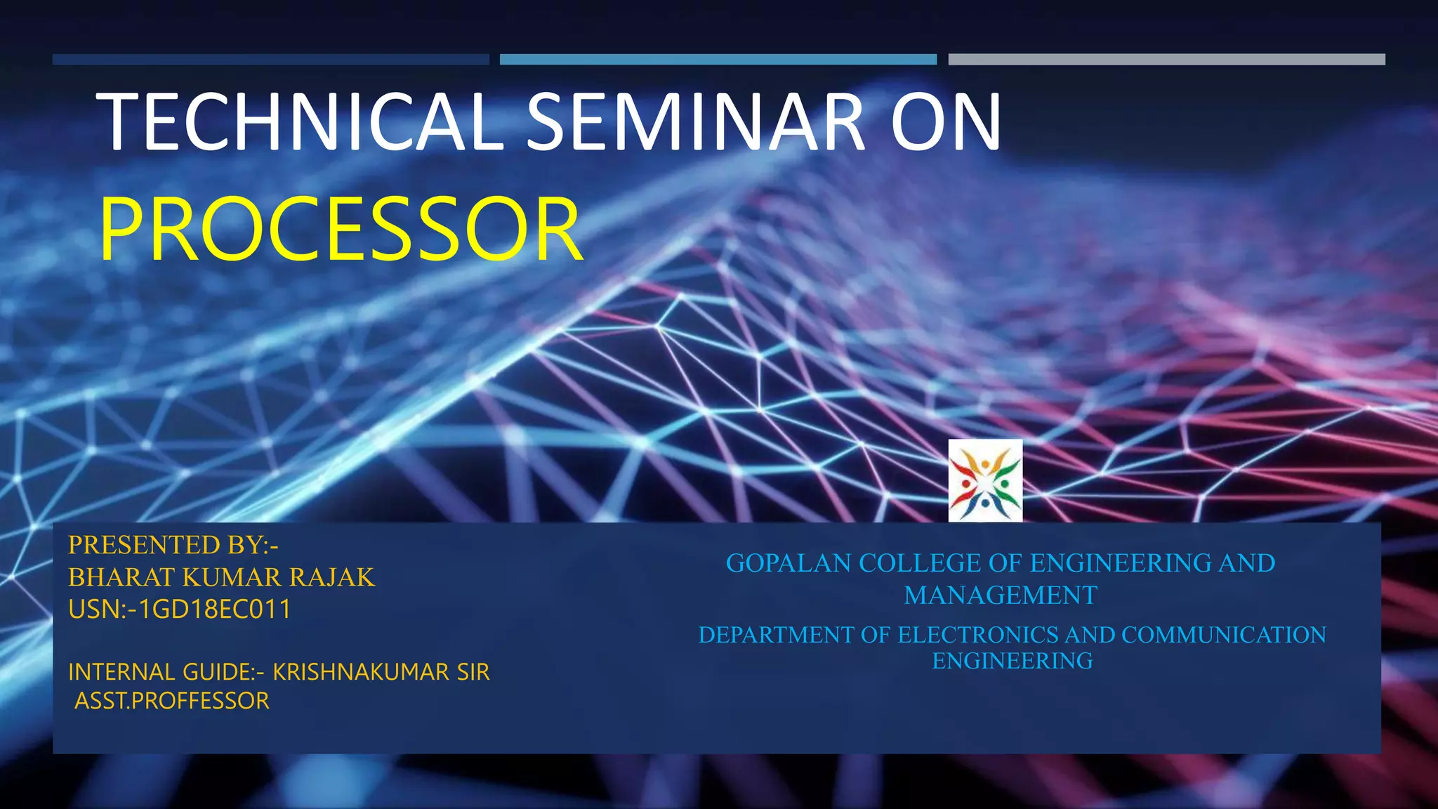 The document summarizes a technical seminar on processors presented by Bharat Kumar Rajak. It discusses the evolution of processors from early transistor-based designs to modern multi-core CPUs. It covers key topics like processor architecture, types of processors including RISC and CISC, applications, and future directions. Examples are provided to illustrate concepts like single-core, dual-core, and multi-core processor designs as well as cache memory and clock speed. The seminar aims to provide an overview of processors, their history, workings and importance in computers and other electronics.
