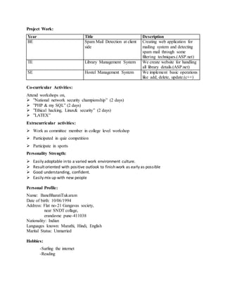 BaneBharatiTukaram is a computer science and engineering graduate with over 3 months of experience as a PHP developer. He has strong technical skills in languages like C, C++, Java, and PHP as well as databases like Oracle and MySQL. His objective is to develop his career in computer engineering where he can share and enrich his knowledge while being a valuable team member.