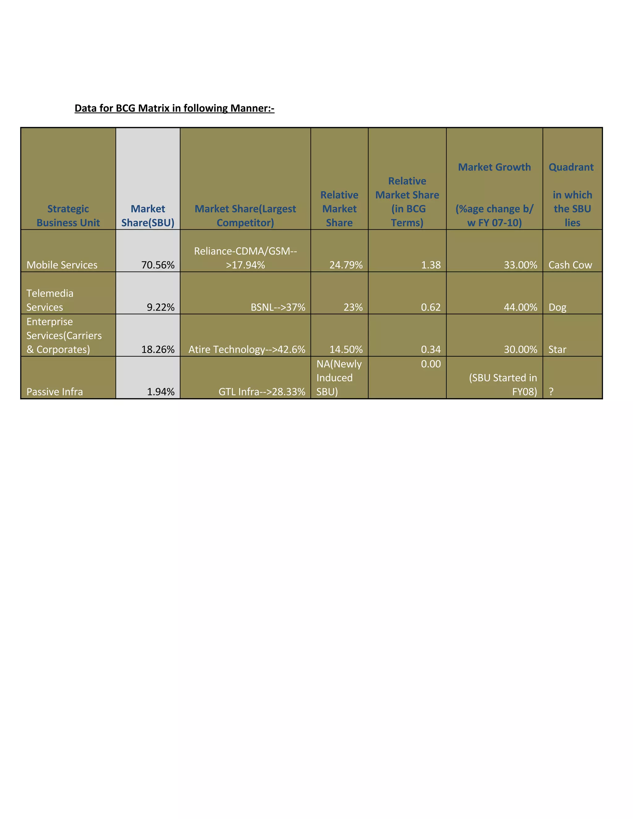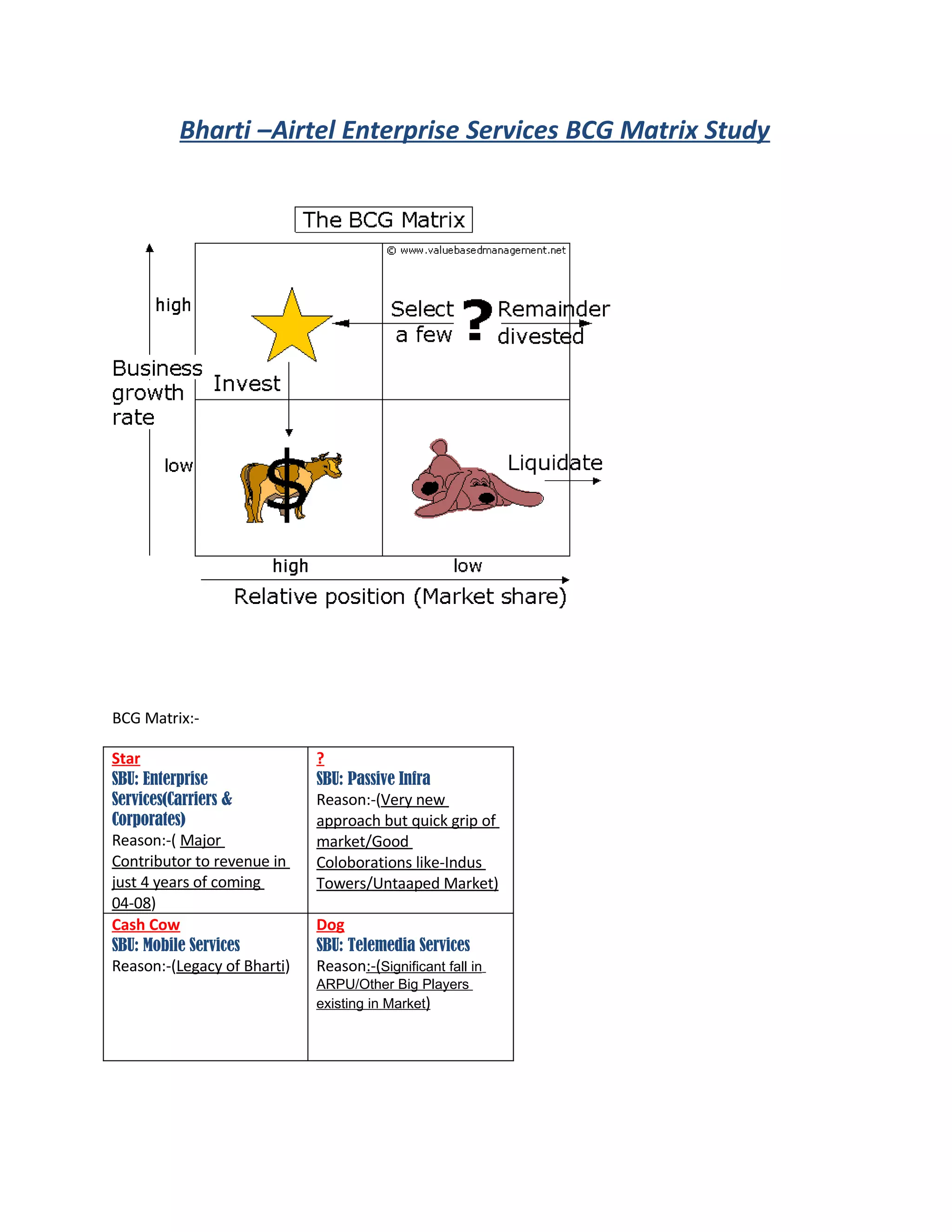Bharti Airtel conducted a BCG matrix study of its strategic business units (SBUs). The matrix shows that Mobile Services is the cash cow with the largest market share. Enterprise Services is classified as a star due to its strong growth and market share gains in recent years. Telemedia Services falls in the dog quadrant with declining market share. Passive Infrastructure is new and its future is uncertain. The document provides details on the market shares and growth rates used to classify the SBUs in the BCG matrix.
