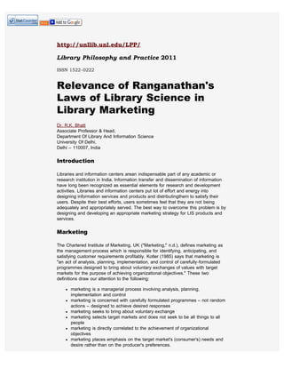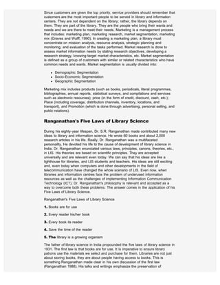 1. The document discusses the relevance of Ranganathan's Five Laws of Library Science in the context of library marketing. The laws emphasize making resources accessible to users and meeting their needs.