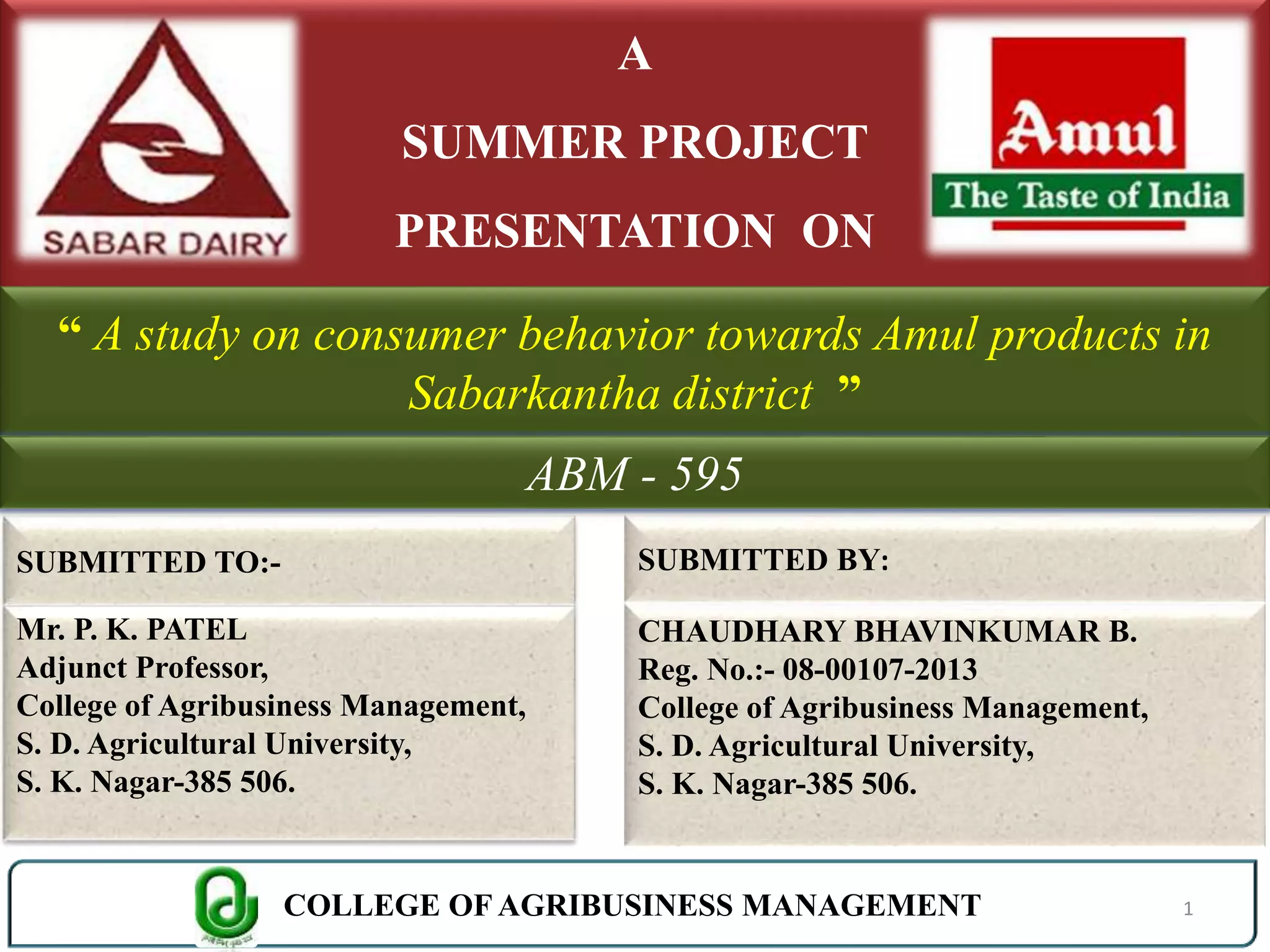 This document summarizes a student's summer project presentation on a study of consumer behavior towards Amul products in Sabarkantha district, India. It includes an introduction on consumer behavior and the dairy industry. It then outlines the project's objectives, research methodology used which was a random sample of 120 consumers across 3 talukas. Key findings included high consumer satisfaction with quality but some issues with availability and price. Suggestions focused on improving product awareness, like for Amul khoa, and increasing local advertising.