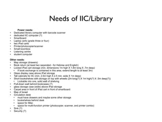 The document outlines the space and equipment needs for an integrated IIC/Library space, including: