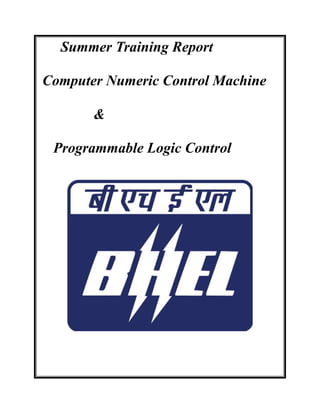 This document provides an overview and summary of Shyamveer Singh's summer training report at Bharat Heavy Electricals Limited (BHEL) in Haridwar, India. The report discusses BHEL's operations in various sectors like power generation, transmission, industries, transportation, telecommunications, and renewable energy. It also describes the Computer Numeric Control (CNC) machine and Programmable Logic Control (PLC) systems that Singh studied. The report acknowledges the guidance provided by BHEL engineers and staff during the training.