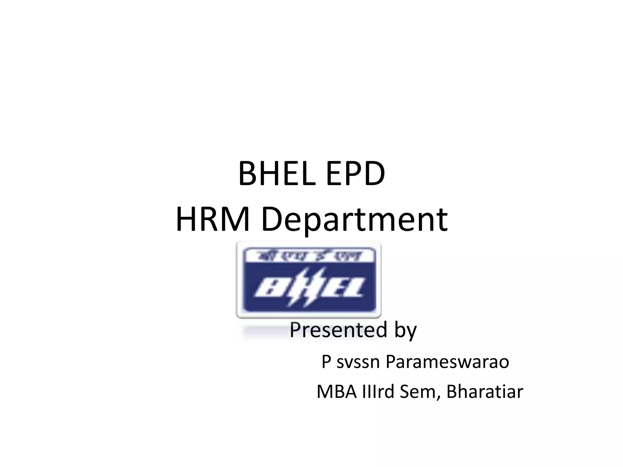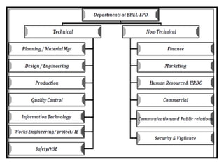 BHEL is India's largest engineering and manufacturing enterprise in heavy electricals, with extensive product presence in various sectors and operations in 52 countries. The HR department focuses on attracting and retaining skilled employees, maintaining good industrial relations, and implementing variable compensation schemes, offering numerous benefits and allowances. Employee training, recruitment, performance appraisal, and promotion policies are structured to ensure career growth and compliance with legal standards, while a trade union facilitates communication between management and workers.
