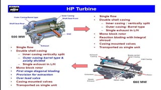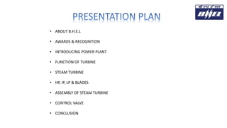 This presentation provides an overview of steam turbine manufacturing by Bharat Heavy Electricals Limited (BHEL). It discusses BHEL's history and awards, introduces steam power plants and the function of turbines. It then describes the key components of steam turbines like HP, IP, LP blades and their assembly. The control valves that regulate steam flow are also explained. In conclusion, it highlights the benefits of BHEL's steam turbine manufacturing process like improved safety, reduced breakdowns and a better work environment.