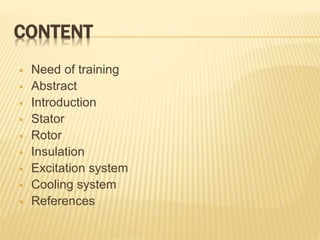 This document provides an overview of an industrial training seminar at Bharat Heavy Electricals Limited. It discusses the need for training, then describes the key components of a turbo generator including the stator, rotor, insulation, excitation system, and cooling systems. Different cooling methods for turbo generators are also explained, such as air cooling, hydrogen cooling, and hydrogen/water cooling.