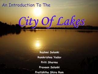 Bhopal is the capital city of Madhya Pradesh, India. It is located in central India and is known as the "City of Lakes" due to the many lakes within the city. Some key points about Bhopal include: