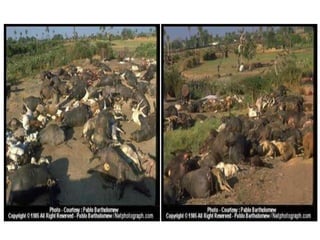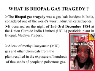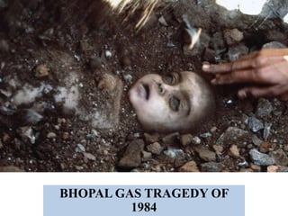 The Bhopal gas tragedy was one of the world's worst industrial disasters that occurred in 1984 in Bhopal, India. A leak of methyl isocyanate gas and other chemicals from a Union Carbide India Limited pesticide plant exposed hundreds of thousands of people to toxic gas. Over 500,000 people were exposed to the gases and many suffered from injuries and illnesses. Official death tolls reported over 3,000 immediate deaths, while other estimates indicate the total death toll may have been over 20,000. Survivors continued to experience health issues long-term.