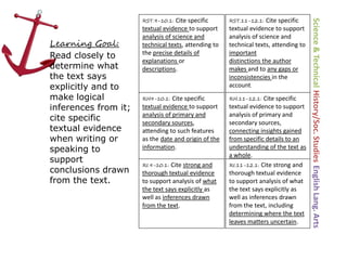 The document outlines assessment criteria for evaluating student responses related to the feelings of Japanese-American evacuees regarding their loss of freedom. It emphasizes the importance of using textual evidence and critical analysis in student writing, where higher-level responses are distinguished by their depth of explanation and selection of specific examples. The grading rubric categorizes responses into advanced, proficient, basic, and below basic, reflecting the level of inference and evidence provided.