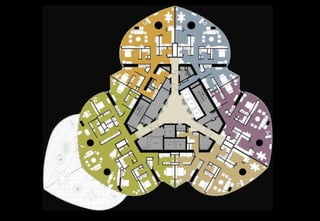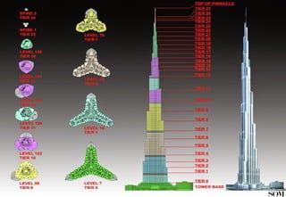 The Burj Khalifa, located in Dubai, is the tallest man-made structure in the world, standing at 828 meters and featuring a mixed-use development including residential, office, and hotel spaces. It boasts 163 habitable floors, the highest observation deck, and significant architectural elements inspired by Islamic design and the hymenocallis flower. The building incorporates advanced engineering techniques for stability, cooling, and evacuation features, and is surrounded by a landscaped area with fountains and greenery.