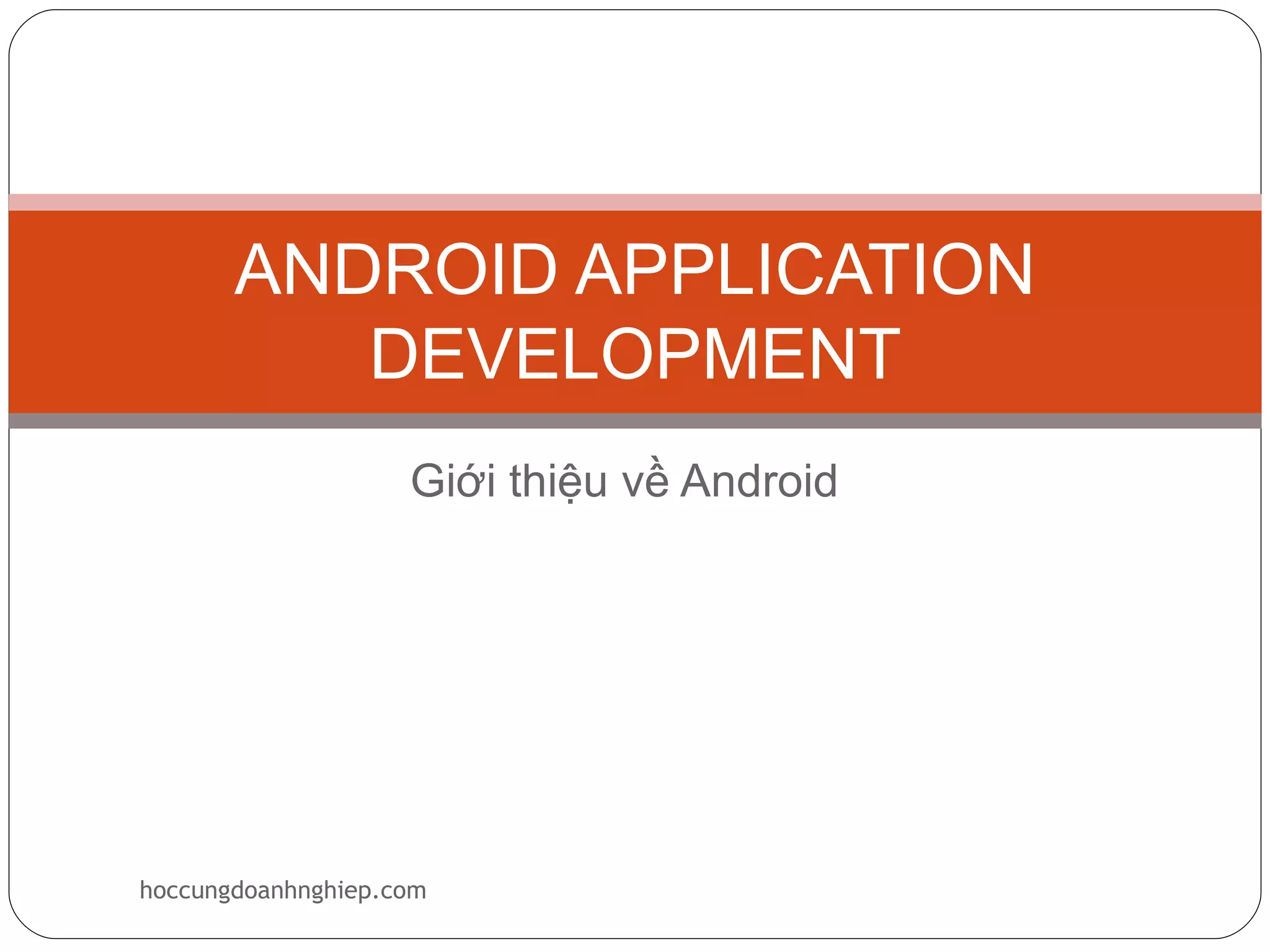 Tài liệu giới thiệu về phát triển ứng dụng Android, bao gồm các yêu cầu đối với lập trình viên, các thuật ngữ và kỹ thuật liên quan đến phát triển trên nền tảng Android. Android là một hệ điều hành mở dựa trên Linux, cho phép phát triển ứng dụng bằng ngôn ngữ Java và native-c. Nó cũng mô tả cách tạo môi trường phát triển ứng dụng cũng như các thành phần chính của một ứng dụng Android.