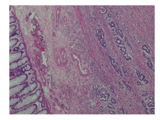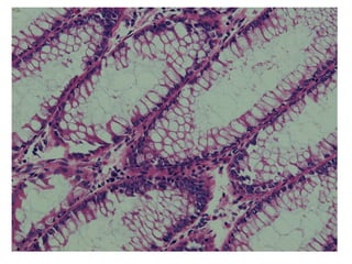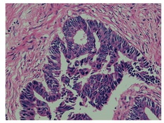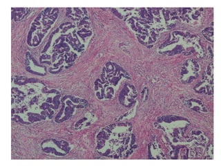 Tài liệu mô tả các loại ung thư biểu mô như ung thư biểu mô tuyến dạ dày, tuyến đại tràng và phế quản, cùng tiêu chuẩn chẩn đoán và đặc điểm mô học. Nó nhấn mạnh các dấu hiệu nhận biết cấu trúc tế bào và mô trong các loại ung thư này, chẳng hạn như tế bào hình nhẫn và phản ứng viêm. Các đặc điểm như xâm nhập lan tỏa và mất cực tính của tế bào cũng được đề cập.