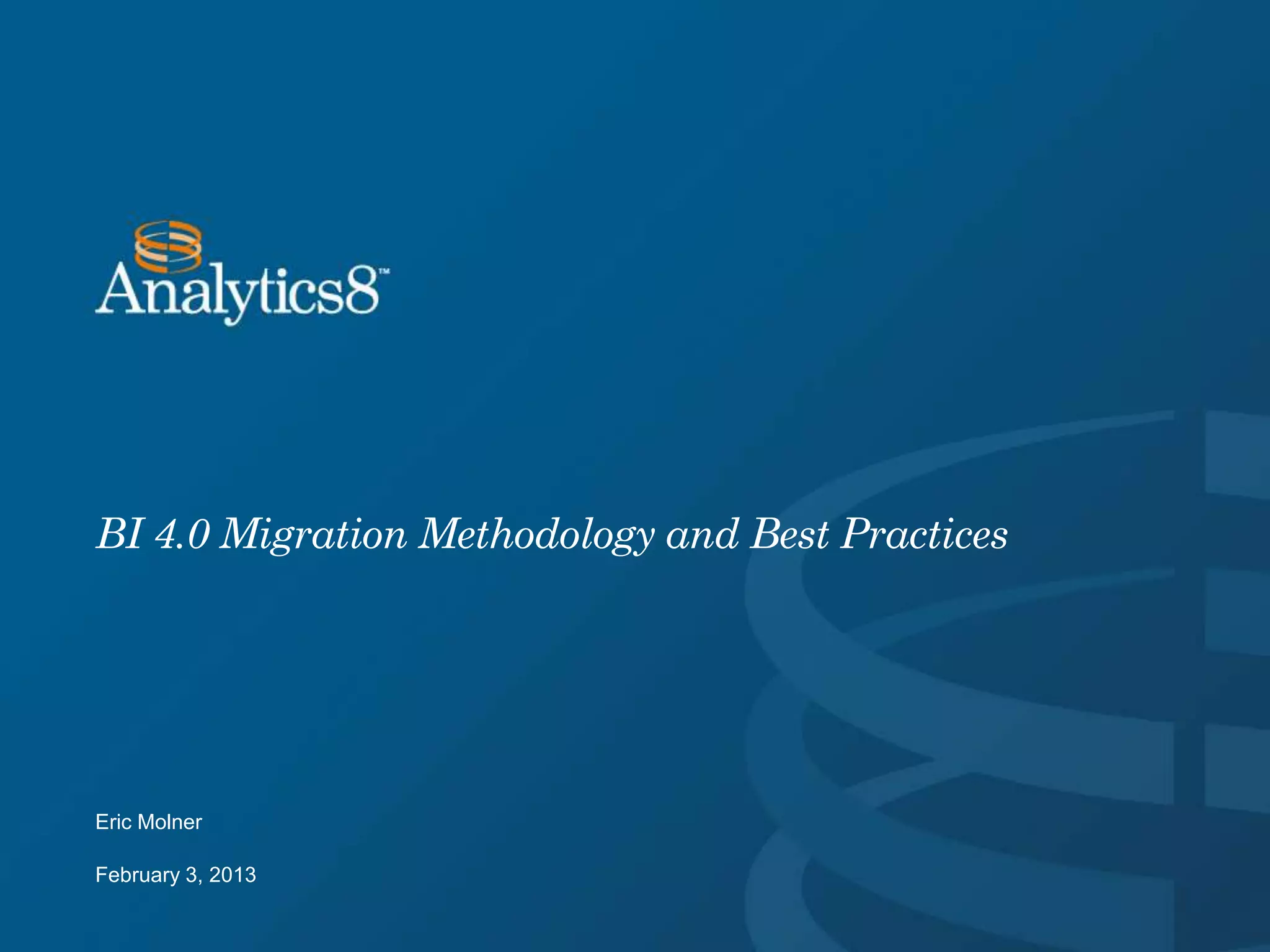The document discusses best practices for migrating to SAP BusinessObjects BI 4.0 including conducting an assessment of the current BI environment and existing content, developing a migration plan and roadmap, installing and configuring the new BI 4.0 software, migrating and converting existing reports and content where needed, testing the new system, and providing training to users. It also outlines Analytics8's methodology for assisting with the various phases of a BI migration project from assessment to deployment.