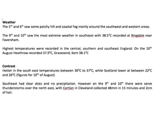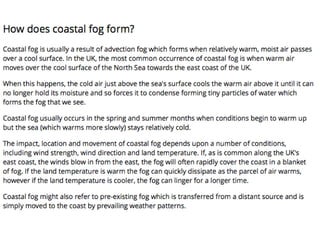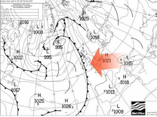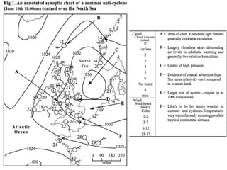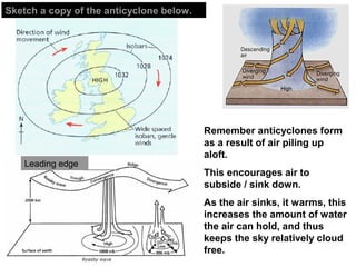 Anticyclones are high pressure weather systems that form over the British Isles frequently. They are characterized by calm winds with widely spaced isobars, sinking air that warms and decreases humidity, causing clear skies. In winter, anticyclones bring cold days and frosts with the potential for pollution inversions, while summer anticyclones result in hot days with hazy sunshine and the risk of thunderstorms from moist air masses. Anticyclones can influence weather conditions for up to 10 days as they move slowly across the region.