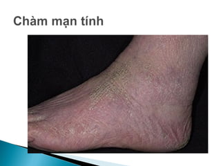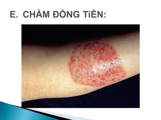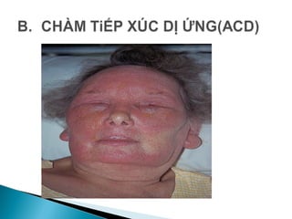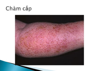 Tài liệu cung cấp thông tin về chàm (eczema), một bệnh viêm da không lây thường gặp, với nhiều dạng như chàm tiếp xúc, chàm tiết bã, và chàm nứt nẻ. Các nguyên nhân chủ yếu bao gồm yếu tố bên trong và bên ngoài, với triệu chứng như đỏ da, ngứa, và mụn nước. Điều trị tập trung vào việc loại bỏ nguyên nhân kích thích và sử dụng các thuốc corticoid, kem giữ ẩm.