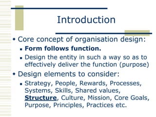 The document discusses organizational design approaches and loose versus strong organizational structures. It presents the six facets of Org2 design - purpose, principles, practices, participants, processes, and pieces. Examples are given for how a loose and strong structure could work in practice for an innovation organization. Strengths, weaknesses, opportunities, and threats are listed for each structure type. The document aims to analyze different organizational design models and considerations for structure.