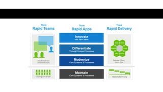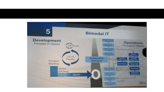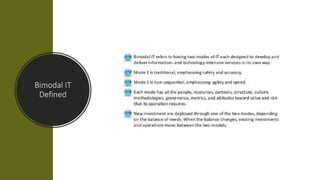 This document discusses bimodal IT and provides use cases for how bimodal IT approaches can be applied in different organizational contexts. Some key areas covered include shadow IT, integration, web 2.0, IT governance, organization, sourcing, data, architecture, synchronization, resources, disruptive strategy, and technology lifecycle management. The document emphasizes that bimodal IT manages two separate but coherent styles - one focused on predictability and the other on exploration.