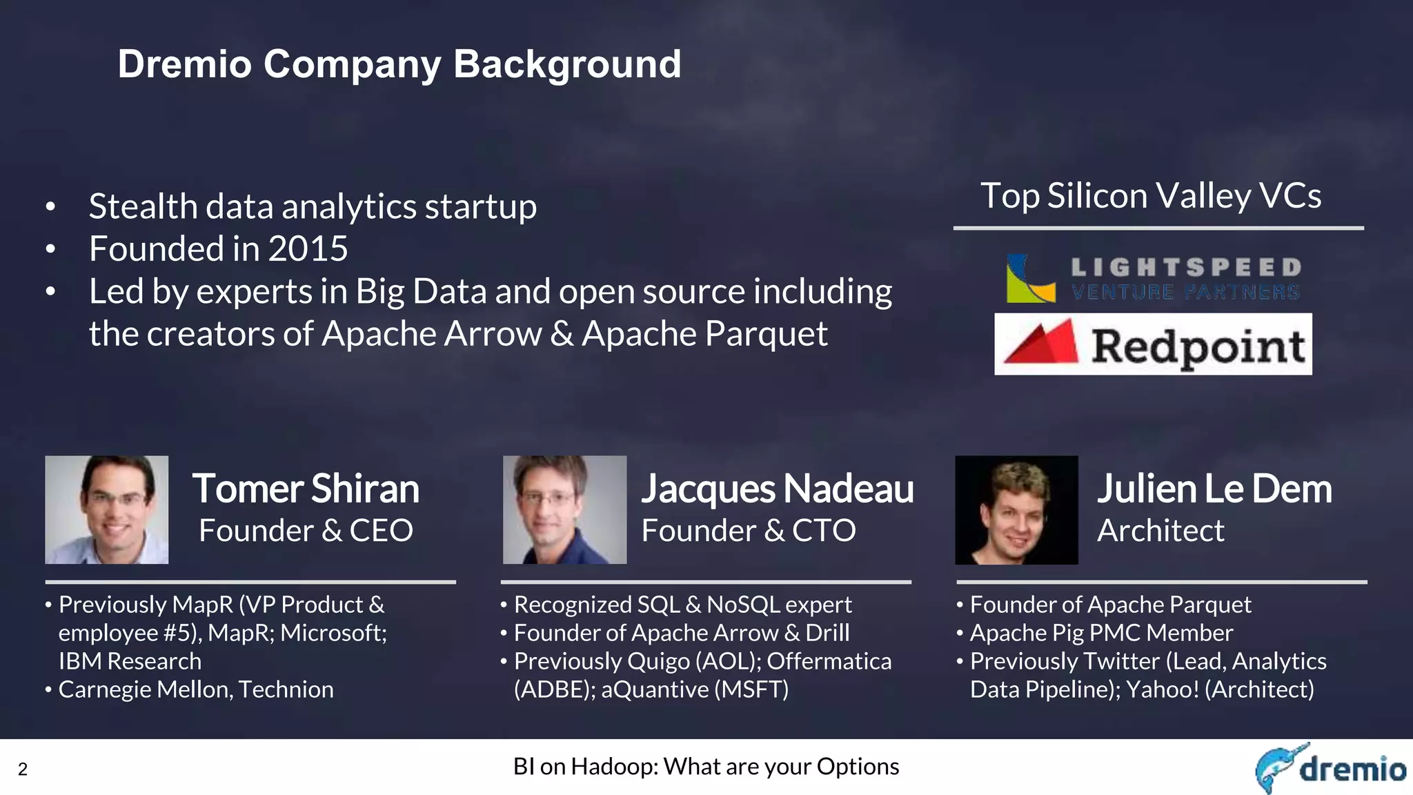 The document discusses business intelligence (BI) options for managing big data, focusing on various approaches like ETL to RDBMS, monolithic solutions, and SQL-on-big-data technologies. It highlights the evolution of the BI landscape from traditional databases to modern data lakes and the challenges associated with big data analytics. Additionally, it outlines the pros and cons of different BI approaches and provides guidance on selecting the right solution based on specific use cases and requirements.