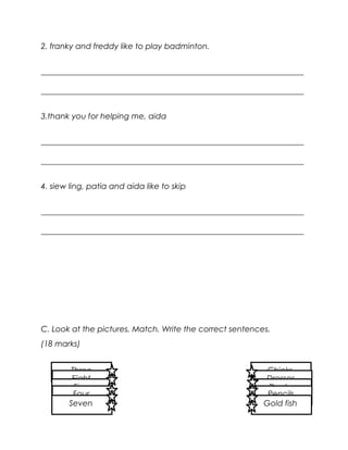This document contains an English language worksheet with multiple parts for students to complete. It includes exercises like filling in blanks in sentences, adding punctuation, matching pictures to sentences, sorting items into groups, making smaller words from larger words, underlining correct words, and matching drawings to descriptions while coloring them. The worksheet tests a variety of basic English language and writing skills through different activity types.