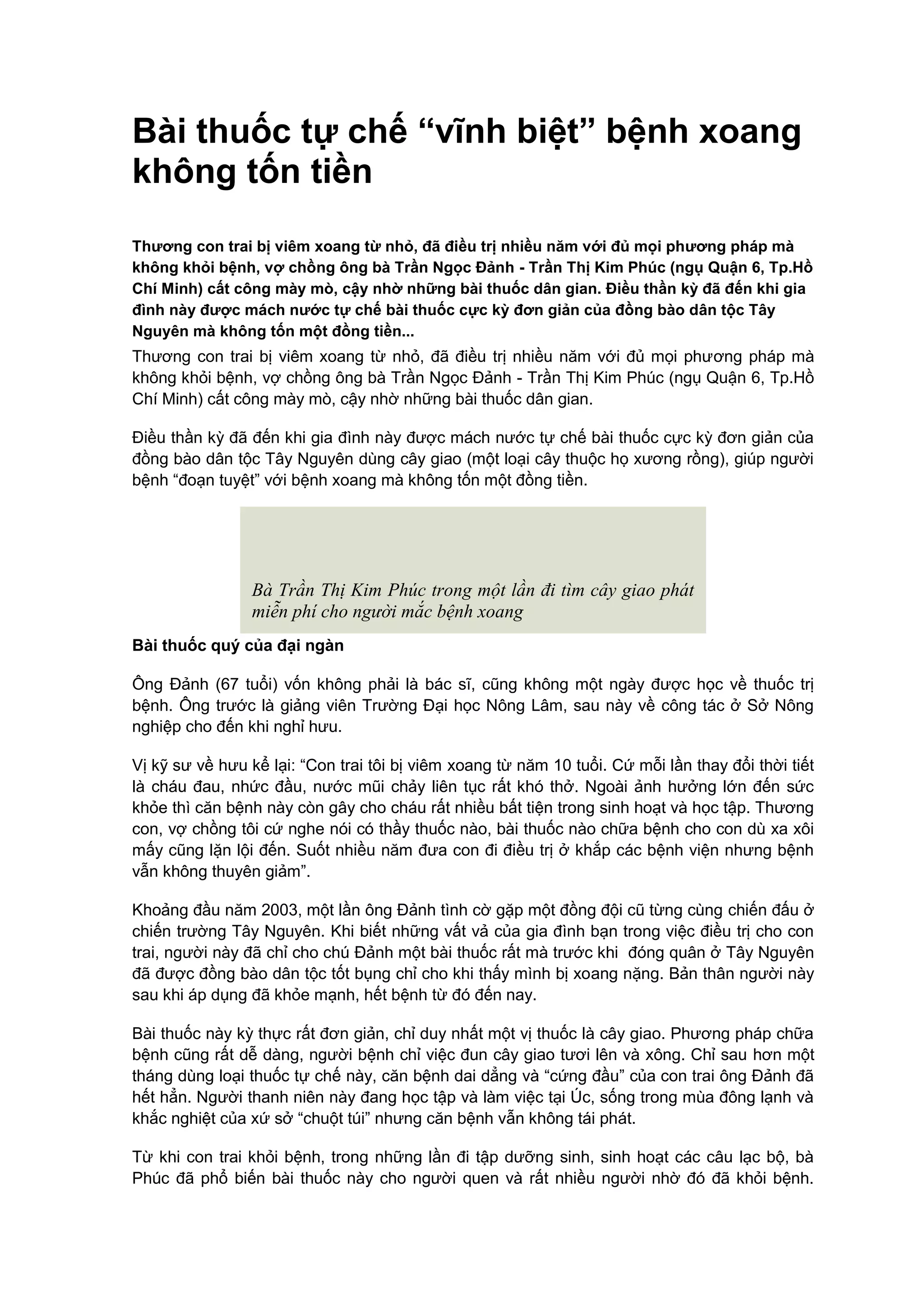 Bài thuốc tự chế từ cây giao của ông bà Trần Ngọc Đảnh đã giúp con trai họ khỏi bệnh viêm xoang sau nhiều năm điều trị không hiệu quả. Phương pháp đơn giản này chỉ cần xông hơi với cây giao, và đã được phổ biến cho nhiều người khác cũng khỏi bệnh. Ông bà còn soạn thảo quy trình chi tiết hướng dẫn cách làm để giúp đỡ những người bệnh khác.