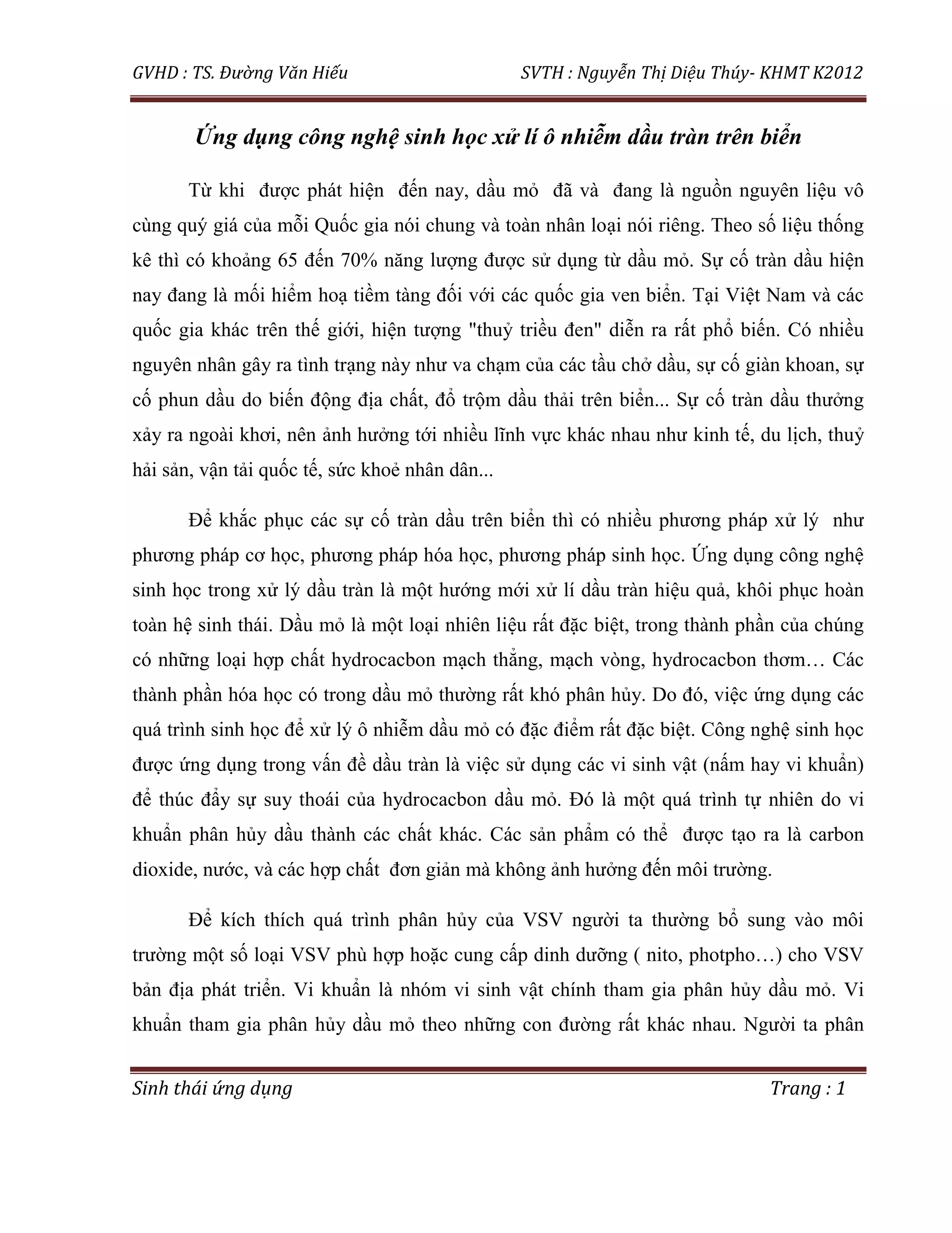 Tài liệu đề cập đến tình trạng ô nhiễm do dầu tràn trên biển và nêu rõ các nguyên nhân gây ra hiện tượng này, cũng như ảnh hưởng của nó đến môi trường và kinh tế. Công nghệ sinh học được giới thiệu như một giải pháp hiệu quả thông qua việc sử dụng vi sinh vật để phân hủy hợp chất hydrocarbon trong dầu mỏ. Các sản phẩm sinh học như enretech-1 đã được phát triển để hỗ trợ quá trình xử lý ô nhiễm dầu tràn, góp phần khôi phục hệ sinh thái.