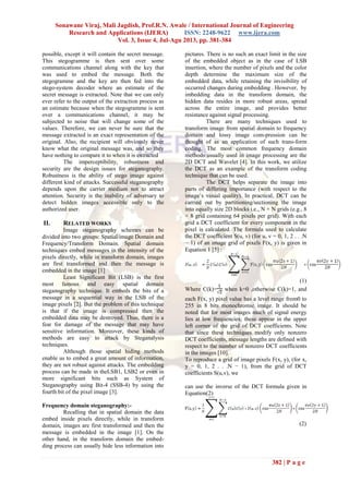The document discusses a DCT-based image steganographic approach that involves embedding secret messages within images using various algorithms. It outlines the differences between spatial domain and frequency domain techniques, emphasizing the advantages of DCT methods for robustness and imperceptibility against detection. Results indicate that DCT-bit 4 technique is more robust than the DCT-LSB method, although the latter offers better image quality preservation.