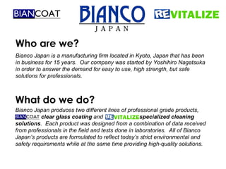 Bianco Japan is a 15-year-old manufacturing firm in Kyoto, Japan that produces two lines of professional products: clear glass coatings and specialized cleaning solutions. The company formulates its products to be environmentally friendly, safe, and high-quality while meeting professionals' needs. Bianco Japan's products include a liquid glass floor coating called BianCoat that protects floors from wear and dirt, and a line of cleaning solutions designed for specific surfaces like tile, stainless steel, and aluminum.