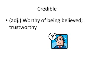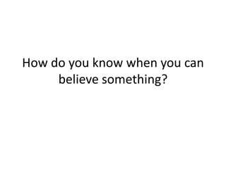 To determine if a source is credible and its information believable, one should consider who wrote it and whether they are qualified, if facts are provided to support claims, and potential biases. Bias can come from a person's perspective or preferences that skew the presentation of information without equally considering alternatives. Media sources also have their own biases in choosing which stories to report on and how they are covered.