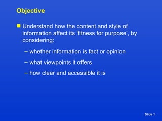 The document discusses how to determine whether information is a fact or opinion and considers the reliability of information sources. It provides examples of statements that are facts versus opinions. It also notes that when evaluating the reliability of a website, it's important to consider the URL extension (e.g. .gov, .edu), endorsements, date of last update, advertisements, and links to and from the site.