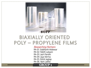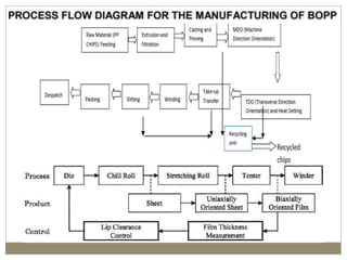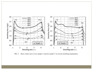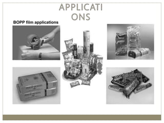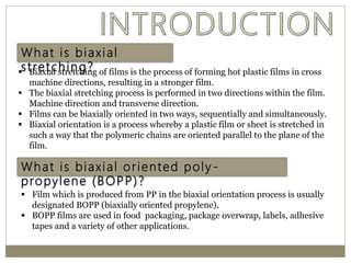 The document discusses biaxial stretching, a process enhancing the strength of plastic films by stretching them in two directions, and its application to produce Biaxially Oriented Polypropylene (BOPP) films used in various packaging. It details the different production methods, the impact of processing variables on mechanical properties, and the advantages and limitations of BOPP films in terms of clarity, resistance, and recyclability. It concludes with insights into the effects of nucleating agents and processing conditions on the performance of BOPP films.
