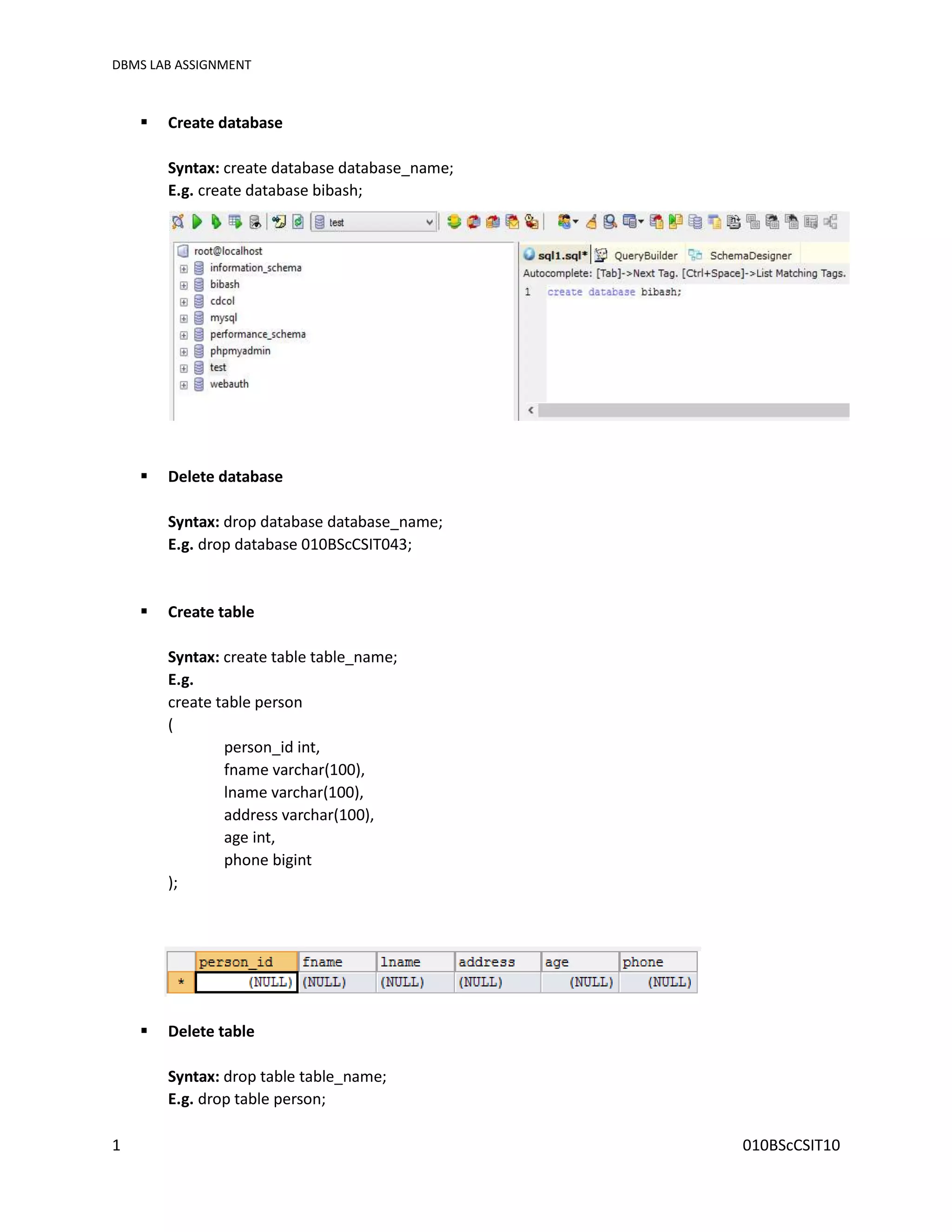 This document provides instructions for various SQL commands used to create and manage databases and tables, insert, select, update, and delete data. It includes commands to create databases and tables, insert data into tables, select data using where clauses, update and delete rows, add and remove columns, and order results. The goal is to teach students how to structure and query a database through hands-on SQL commands and examples.
