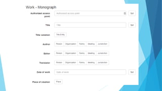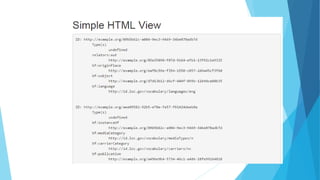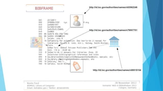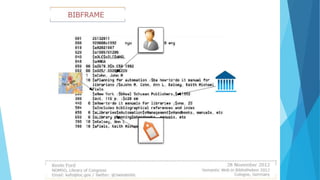 Robin Fay presented an update on the Bibliographic Framework Initiative (BIBFRAME). The presentation covered the need for BIBFRAME as MARC records have limitations for machine processing. FRBR and RDA were discussed as models that focus on relationships between works, expressions, manifestations and items. XML was presented as a way to encode bibliographic data in a machine-readable format using elements rather than character strings. The semantic web and linked data were discussed as ways to make metadata shareable on the web. BIBFRAME was introduced as a new bibliographic framework to replace MARC that would use RDF to encode bibliographic data.