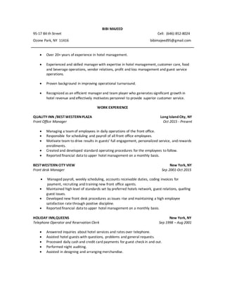 Bibi Majeed has over 20 years of experience in hotel management. She is currently the Front Office Manager at Quality Inn/Bestwesternplaza in Long Island City, NY, where she manages employees and is responsible for daily operations, scheduling, payroll, and reporting financial data to upper management. Previously, she held front desk management positions at Bestwestern City View in New York, NY and worked as a telephone operator and reservation clerk at Holiday Inn, Queens and Roger Williams Hotel in New York. She has a high school diploma from Guyana and computer training certificates.
