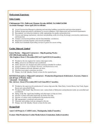 Bibin John Baby is a 24-year-old mechanical engineer seeking a challenging position to leverage his abilities and establish standards. He has over 5 years of experience in shipbuilding, repair, production, quality checking, and materials management. He holds a BE in Mechanical Engineering from Anna University and has experience managing construction projects and coordinating mechanical, electrical, and plumbing works. He is proficient in AutoCAD, piping works, unit erection, and quality inspections.