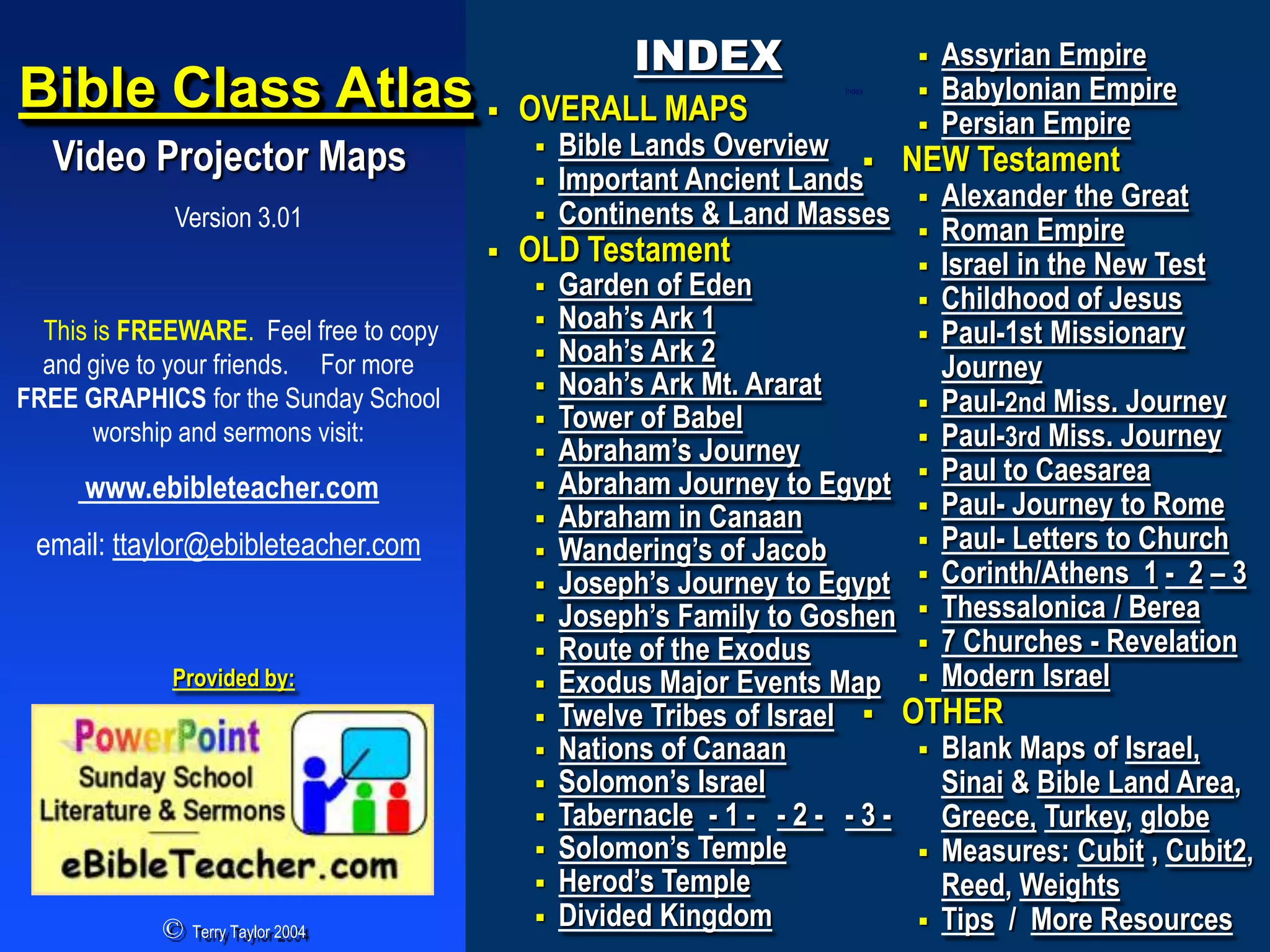 The document contains an index and overview maps for a Bible class atlas, including maps of: the Assyrian and Babylonian Empires; Abraham's journeys; Noah's Ark locations; the Exodus route; Paul's missionary journeys; and the 7 churches of Asia mentioned in Revelation. It provides information on using the interactive Bible maps for teaching.